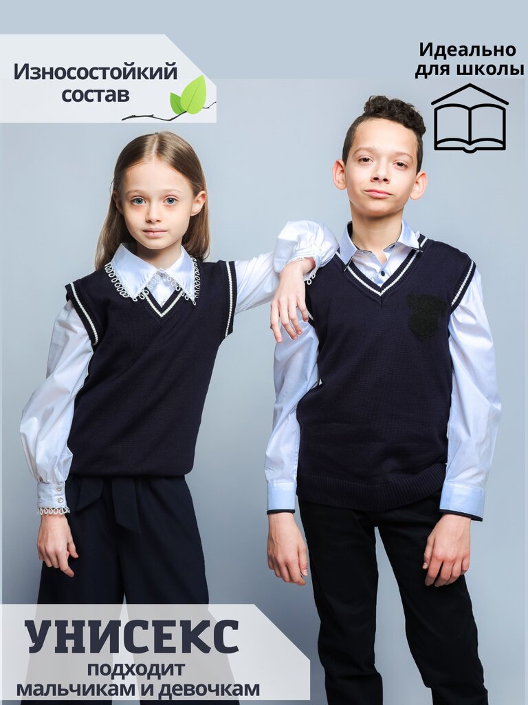 Школьный жилет для мальчика и девочки. Спинка и перед выполнены из высококачественного износостойкого трикотажа. V-образная горловина отлично сочетается с рубашкой . Хороший состав материалов обеспечивает жилету достойный внешний вид и долговечность.