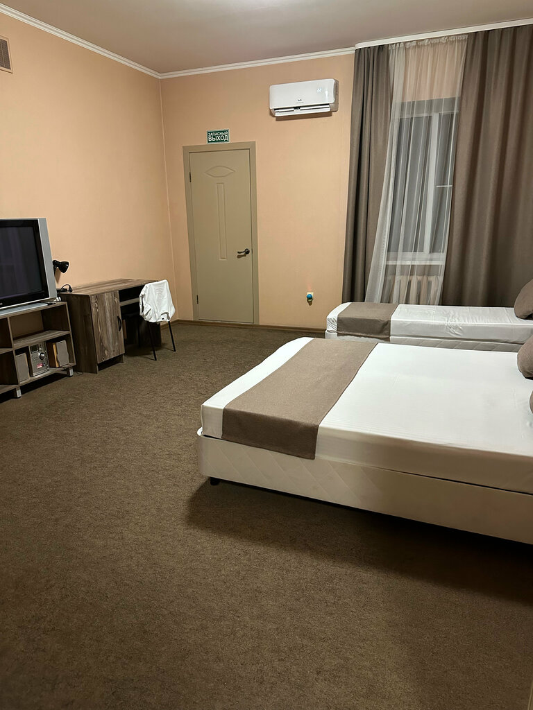 Отель имеет удобное расположение: в шаговой доступности пятёрочка, автовокзал, торговый комплекс Радуга. Чуть дальше, но дойти можно прогулочным шагом до ТРЦ Мармелад. В самом отеле чисто, опрятно, не шумно. Территория отеля маленькая, парковка не более чем на 5-6 машин. Припарковаться можно и за воротами отеля возле кафе, но это всё таки не во дворе, хотя это один комплекс. Бронировали стандартный номер на двоих на 2 ночи. Номер светлый, тёплый и чистый. Недостатки: неудобное расположение розеток, которых всего три (для телевизора и две в самом низу у кровати). Отсутствие фена в ванной. Зубные наборы, видимо, не входят в концепцию отеля. Для нас неудобным оказался матрас, пружины хорошо ощущались и было чувство некоего проваливания в матрас. Ну и постельное и банные принадлежности требуют уже замены. Видно, что всё стирается, гладится, отпаривается, аккуратно складывается. Но все уже не новое, посеревшее от времени. Плюсы: как уже писала, чисто и тепло. В номере мини-холодильник. На этаже микроволновка и кулер. Видно, что хозяева стараются, но поработать есть над чем.