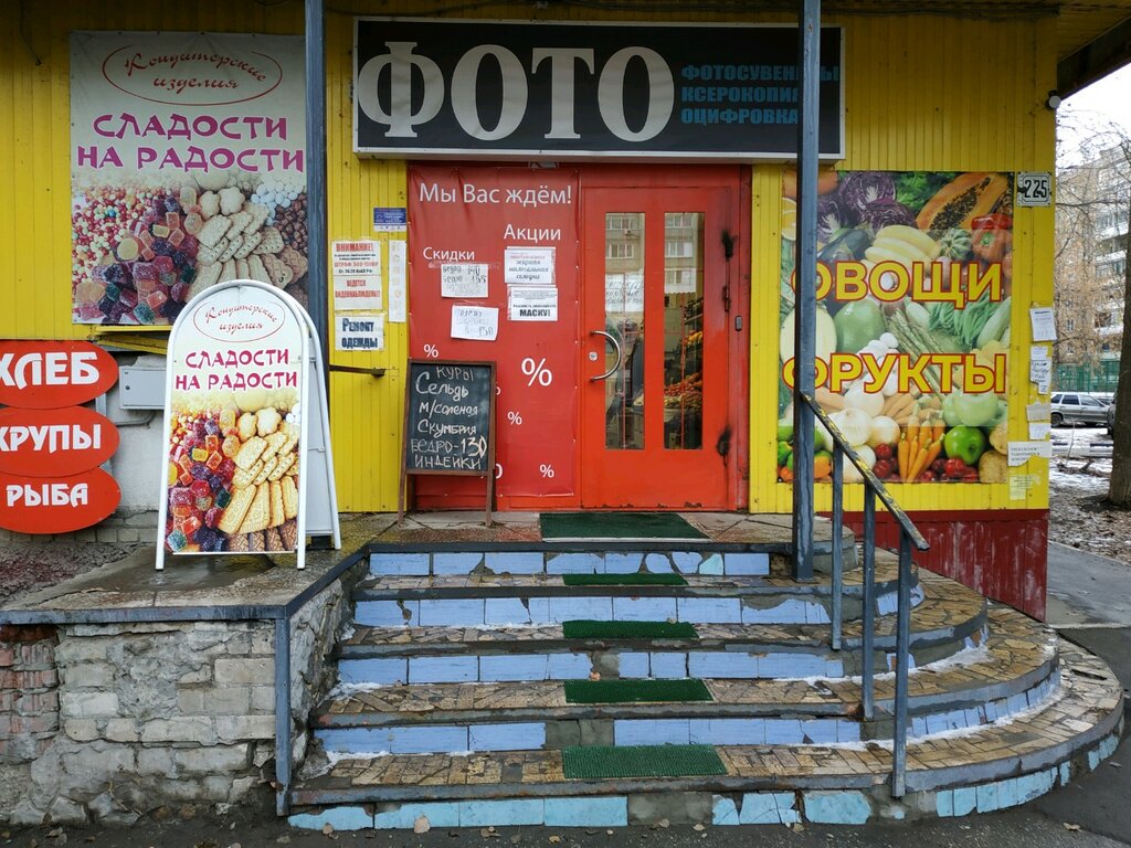 В этом магазине не только Fотоэкспресс, а также овощи, фрукты и сладости, хлеб. В фотоэкспрессе в продаже канцтовары любые, сумки и ранцы, шарики, сувениры. Выбор товаров очень большой. В сладостях огромный выбор выпечки, конфет, чай, хлебобулочные изделия, и даже замороженные полуфабрикаты, пельмени, куры, масло. Недавно стали продавать солёную селёдку и скумбрию. Немного дороже выпечка, чем в других магазинах, зато рядом с домом, не надо никуда ездить. А в овощном отделе я всегда покупаю картофель, свеклу, орехи. Также в продаже соки, сухофрукты, макаронные изделия, томатные соусы, подсолнечное масло. Продавцы во всех отделах оооочень дружелюбные, отзывчивые не только к покупателям, но и друг к другу. Вообщем приходите, убедитесь сами, и без покупок точно не уйдете.