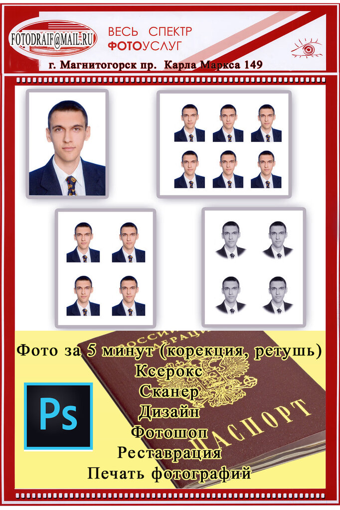 Делала фото на паспорт, заняло минут 10 с фотошопом и печатью, руки золотые, очень понравились,освещение хорошее, ходите туда не ошибётесь