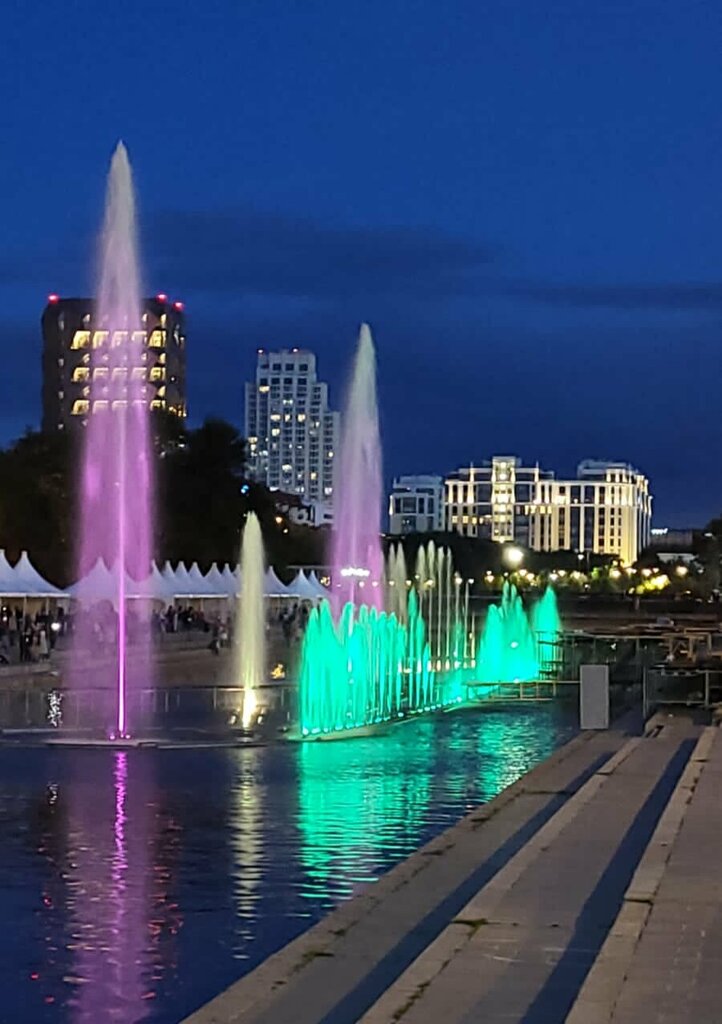 Классный фонтан. Жаль только обслуживают его плохо. Когда пришли в середине июля, шоу началось, но не работала вторая дорожка и поворотные форсунки ( которые являются интересной и важной частью фонтана). Три поездки в августе не увенчались успехом вообще. Первые две фонтан отключали в связи с разбором сцены на день города и сборки палаток после фестиваля. Во время третьей на фонтане горели отдельные светодиоды и также не было даже демонстрационного режима. Сохранились видео шоу в мае - тогда фонтан был наиболее исправен.