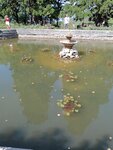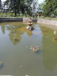 В фонтане плавают золотые рыбки и черепаха