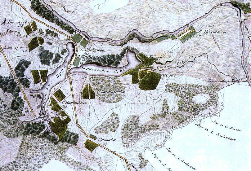 "БРАТЕЕВО", пруды-отстойники. Юго-юго-восточнее Братеевского пруда (см.). 5 параллельных друг другу узких прямоугольных забетонированных водоёмов дл. ок. 100 м и шир. ок. 15 м, а также ряд сходных объектов меньшего размера. В своей совокупности образуют квадрат 140 х 140 м. БРАТЕЕВСКИЙ ПРУД (авт.). В первом приближении прямоугольная копань в Братееве между ул. Ключевая и Паромная, почти на водоразделе рек Москва и Городня. Дл. 360 м, шир. 110 м. Пл. 4 га. В сев. части имеются фонтан, забетонированный остров и пешеходный мост через весь пруд. Маленький островок есть также в юго-зап. углу акватории. Берега забетонированы, местами ограждены. Далее находятся травяные откосы высотой ок. 2 м. По углам создано подобие трибун. Связи с известными элементами естественной гидросети нет. Информация с сайта https://temnyjles.narod.ru/Reki3-16.htm Моё предположение, что на этом месте действительно был продолговатый пруд (см. фото старинной карты, видно на этом месте есть водоем), который в ходе застройки района решили "облагородить" бетонными берегами. Также было у меня предположение, что это регуляционный пруд, на подобие прудов в Марьине, но найти этому доказательств я пока не смогла.