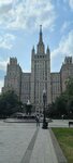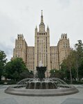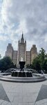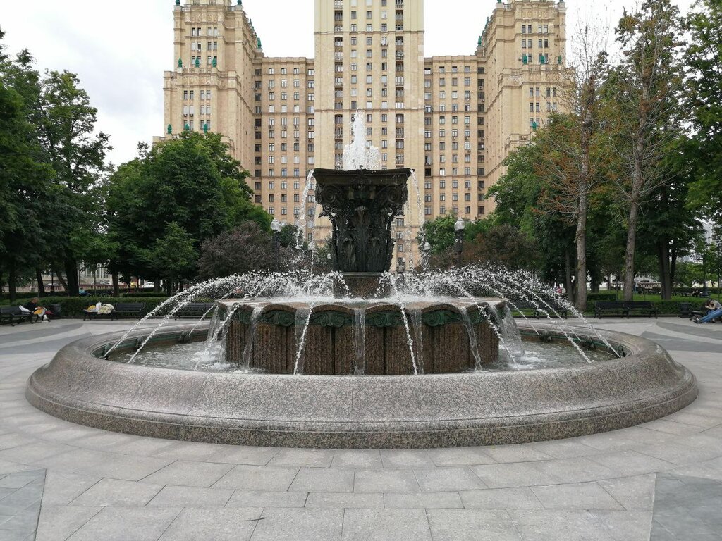 Фонтан на площади около визитной высотки города Москвы в сквере с большим количеством деревьев всегда привлекает внимание. Это и красиво и освежает в жаркий день. Вид на этот фонтан со стороны Садового Кольца открывается великолепный. И всегда, когда я бываю в этом сквере, - всегда я к нему подхожу и любуюсь им.
