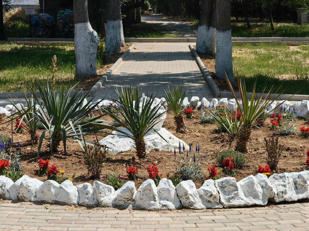Клумба с цветами и пальмами. Фонтан давно не работает. Но выглядит ухоженно и радует глаз