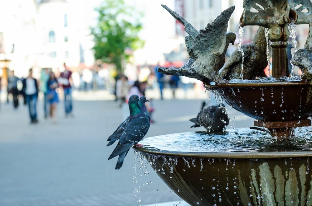 Симпатичный фонтан у колокольни Богоявленского собора. Голуби пьют воду из чаши.