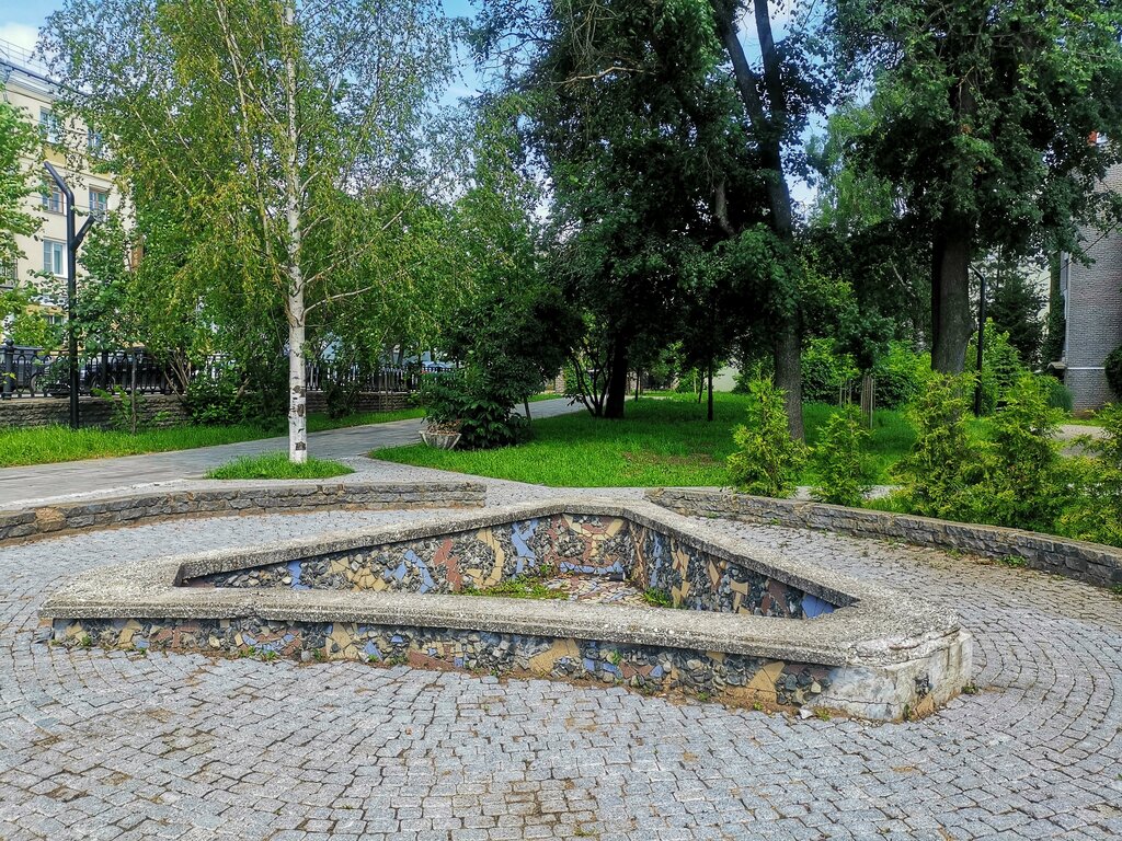 Интересный по своему дизайну бывший фонтан, который выглядит теперь как пустой бассейн. Вряд ли его когда-нибудь восстановят, так что лучше бы завалили внутреннюю часть землёй, сделали бы там газон и посадили цветы. В сквере бы тогда веселее было.