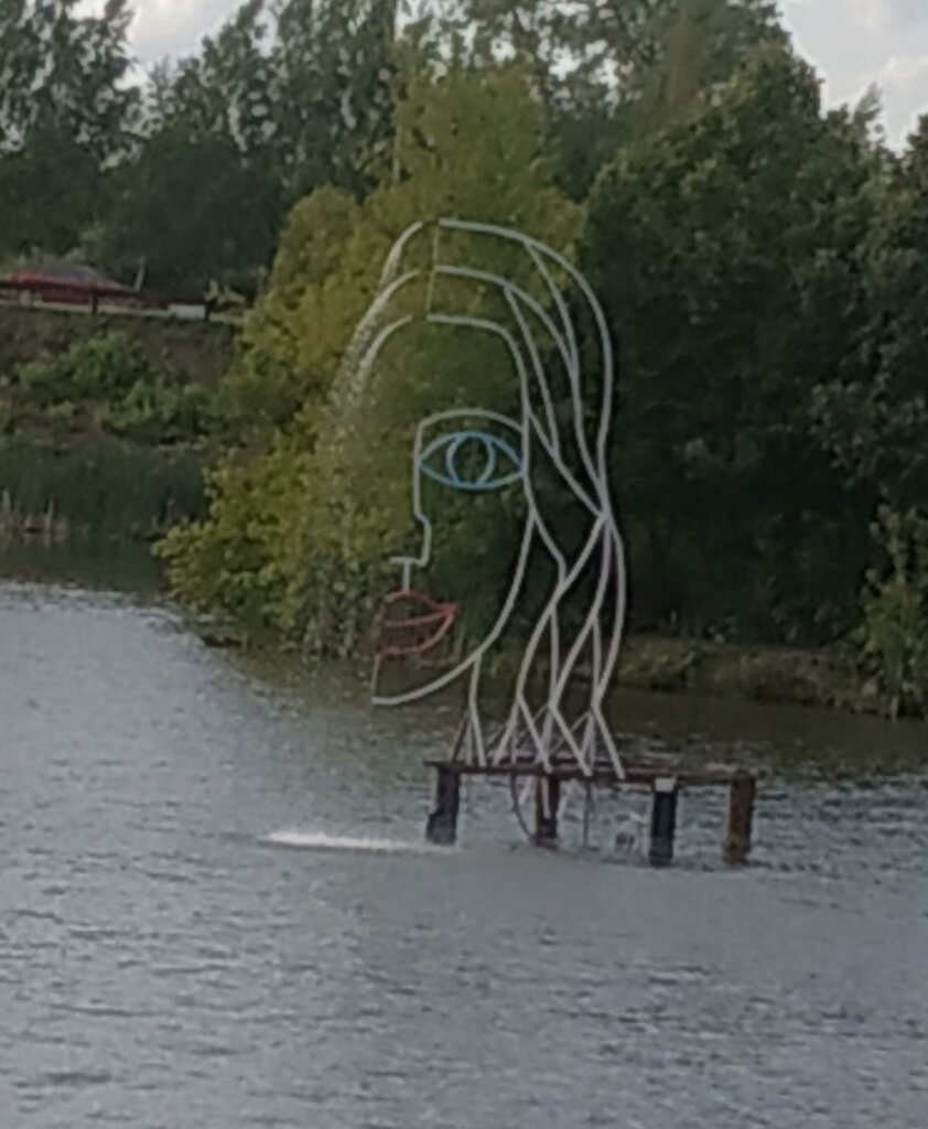 Фонтан необычной формы на пруду. Выполнен в виде женской головы, вместо прядей волос - струи воды. Спорное вошло решение, но, как минимум, оригинально.