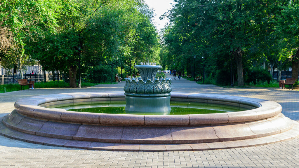 Фонтан красивый, не поспоришь. Недавно отреставрировали, но вот вокруг фонтана. Соль на плитке портит общий вид картины. Заросшие травой и порослью деревьев клумбы смотрятся неопрятно. Впрочем смотрю начали обрезку сухостоя, возможно и до клумб доберутся. Приятное место чтобы спрятаться в жару: есть тень от деревьев и скамейки