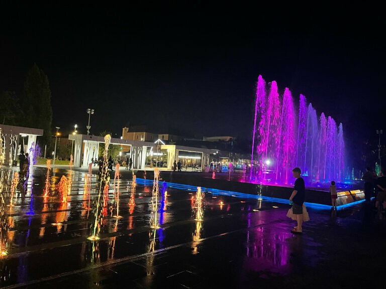 Очень красивый фонтан. Особенно шоу я смотрела про пензу проектор светил прямо на фонтан. Дети могут поиграть с маленькими фонтанчиками в земле