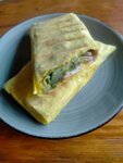 Блин с овощами и курицей. Ваш помощник в борьбе с голодом. Немного хрустящий блин. Внутри маринованная в соевом соусе филе курицы, свежие овощи: пекинская капуста, спелые помидоры. И все это заправлено вкуснейшим соусом и сыром.