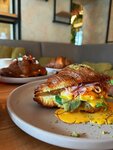 ростбиф, салатный микс, фирменный соус трюфельный, картофель фри, вяленые томаты, красный лук, яйцо куриное