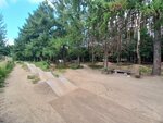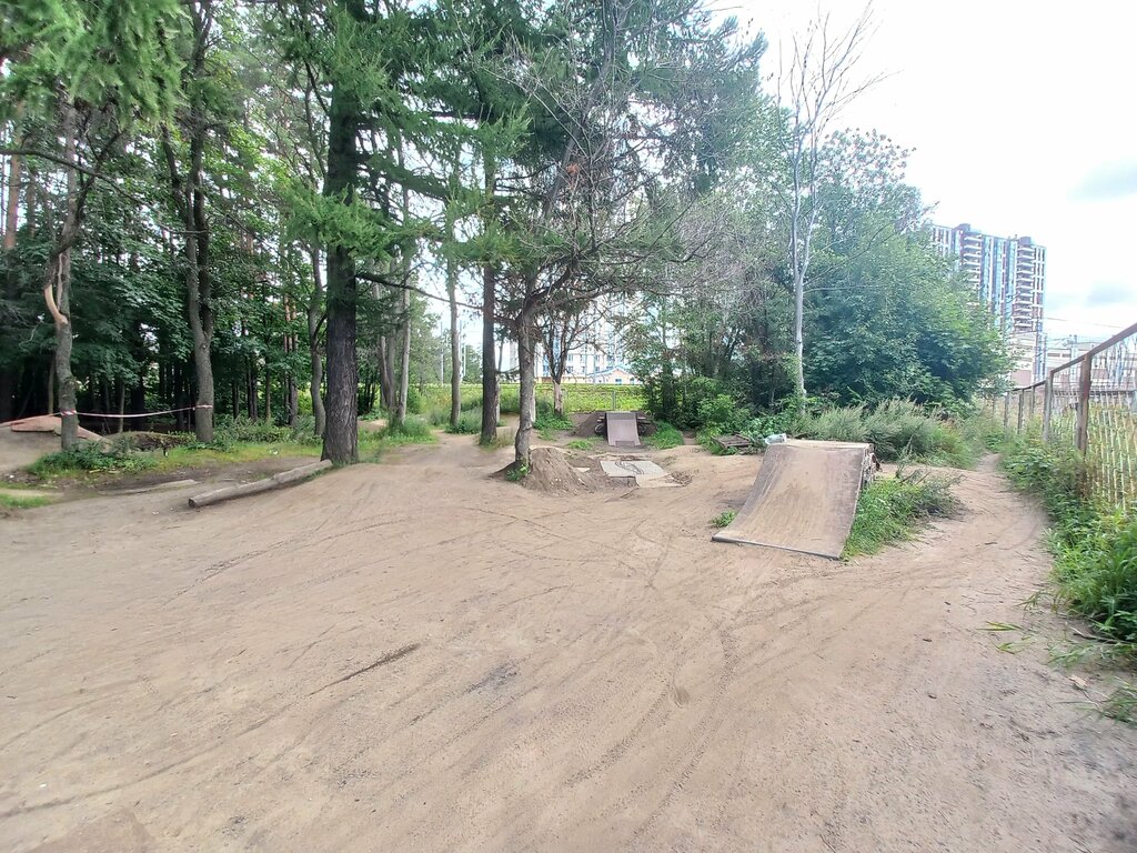 Отличный спот, подойдёт для разного уровня катания, есть довольно хороший памп трек, перед которым имеется небольшая разгонка, на памп треке есть несколько траекторий движения, на нем скорость набрать нетрудно. Также есть учебный вылет, с контр уклоном в конце, на вылет разгоняться проще с памп трека. Также присутствует дерт серия, состоящая из 5 трамплинов, на них есть очень хорошая разгонка, на которую нужно подняться по лестнице. Есть беседки и место где можно отдохнуть. Иногда может показаться что кочки не качаются, прыги не допрыгиваются, но немного практики и все будет отлично 👍🏾. В общем спот топовый