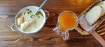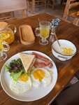 Приходили на завтрак Порции по размеру средние Каша рисовая так себе, водянистая и безвкусная английский завтрак хороший Персонал вежливый и приветливый🌸 В заведении чисто, протирают как столы так и лавки
