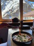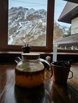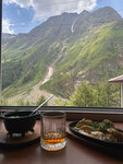 Как оказалось место позиционируется как кафе для людей , которые целый день катались на горе или хотя бы прокатились на канатке побродили сверху вернулись уставшие и зашли попить чайку. Они удивились, когда мы в обед забронировали столик на вечер и еще больше удивились, когда мы пришли) Сейчас уже не помню, что мы заказывали, но было вкусно. Я как типичный житель восточно-европейской равнины наибольшее наслаждение получил от вида в окне)
