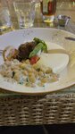 Паста с морепродуктами, выглядит аппетитно , но есть не возможно! Панцырь от мидий попадает в макароны.. и на зубах остается хруст раковины.. ужасное чувство , сковородка со свининой тоже была не очень , соус слишком острый ,овощи жирные . Своих денег эти блюда не стоят !! Отдали около 3 тыс + 2 бокала вина. Но блюда были не вкусные ! Очень жаль что в таком симпатичном месте , не вкусная еда ! И еще большой при большой минус это музыка ! Орет колонка ,что сидя за столом друг напротив друга общаться было невыносимо .