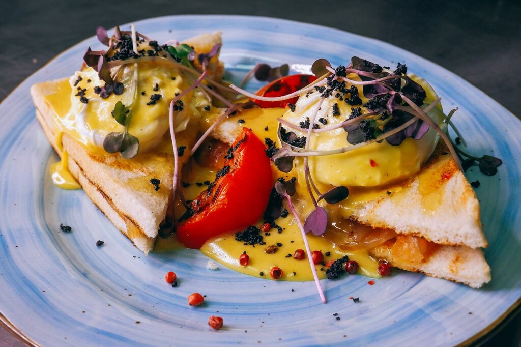 Завтрак с яичницей глазунья, обжаренной колбаской дебрецинер или беконом на выбор, воздушной булочкой, свежими томатами черри и брусничным конфитюром