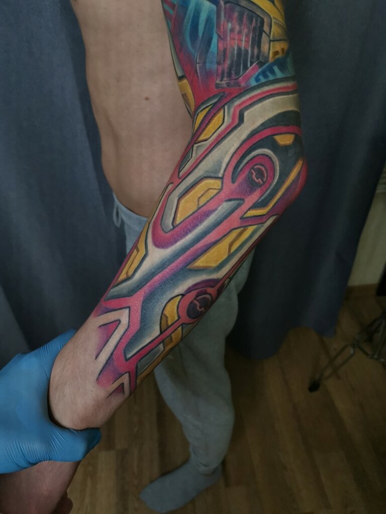 Познакомилась с мастером благодаря моему товарищу - Костина работа украшала его плечо. Сочно, четко, плотно, то что нужно, подумала я и пошла. На консультации обсудили идеи будущего эскиза, набросок Костя прифотошопил к моей руке. Идею я передала не точно, получился неожиданный вариант, без проблем перерисовал по новому, с геометрией у него все ок (у меня решетка готического собора), предложил несколько цветовых вариаций на выбор, все устроило и начали делать. Проработка деталей хорошая, объём присутствует, все чётко, контуры не плывут, что ещё нужно?) Остался последний сеанс-фон и все готово. Текущий результат мне нравится, Костя знает своё дело, всегда на связи чтобы что-то дополнительно обсудить, на встречу идёт если что-то не нравится, приятный подход) Единственное, процесс идёт не быстро, может конечно потому что у меня кропотливая работа. Короче Костю друзьям бы порекомендовала:))