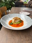 Приготовленное на гриле филе трески с ярким неаполитанским соусом из томатов, маринованных в собственном соку, с зелеными оливками, каперсами и базиликом. В качестве дополнительной текстуры — слайсы свежего спелого авокадо