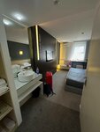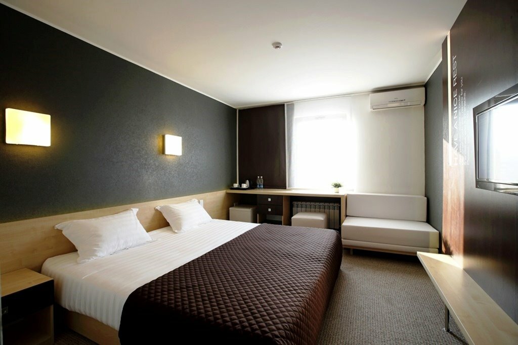 Nice hotel away from the center. Room 201 is small, but everything you need is available: bathrobes, towels, a luxurious bed, TV, air conditioning, safe, kettle, mini fridge, tea, coffee, water and glasses. Room service can be ordered. Friendly staff. Breakfast, a good buffet included in the price (seasonal fruits, vegetables, fresh juices, cheese and meat cuts, hot dishes, breakfast cereals, dried fruits, desserts) Hot porridge or omelet will be prepared upon your request, you need to contact the concierge or the kitchen staff. The eating area has a coffee machine and a water cooler with 24-hour access, fresh pastries, there are not many tables inside, there is a terrace. They are allowed to bring their own drinks, not far from the Globus supermarket.