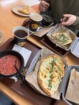 Лепешка с сочной начинкой, белого соуса, сыра моцарелла и зелени.