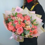 Состав: S: 15 роз, зелень, ковыль, упаковка, лента. M (на фото) : 21 роза, зелень, ковыль, упаковка, лента. L: 51 роза, зелень, ковыль, упаковка, лента. Если что-то отсутствует в наличии флорист предложит альтернативный вариант.