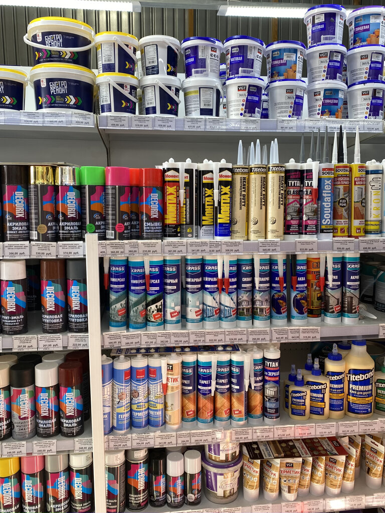 Отличный выбор лакокрасочных продуктов, найдёте всё и на любой кошелёк. Есть услуга колеровки краски, эмали и лаков для дерева.