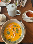 Красивое и вкусное место. Нарядная входная группа уже настраивает на хорошее настроение. Понравился выбор блюд. Обширное меню. Выбрали супы - куриный и том ям. Вкусно и сытно. На горячее - стейк Джек с гарниром. Мясо немного жирное на мой вкус, но повар хорошо разделал кусок и жирная часть уже отделена от основного. Овощи и картофель вкусно дополняют блюдо. Вкусный чай. Комплимент в виде мороженого - был очень приятен. Наш обслуживал Игорь- профессионально и дружелюбно, спасибо ему большое. В первой половине дня было немного людей, к ланчу уже заполнялось плотнее и, вероятно, лучше бронировать стол.