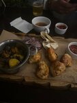 Выход: 340/30 Состав: луковые кольца, свиные чипсы, чесночные гренки, копченый сыр сулугуни, колбаски охотничьи, копченые крылья