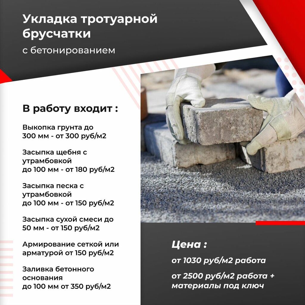 Укладка тротуарной брусчатки с бетонированием от 1030 руб. м2