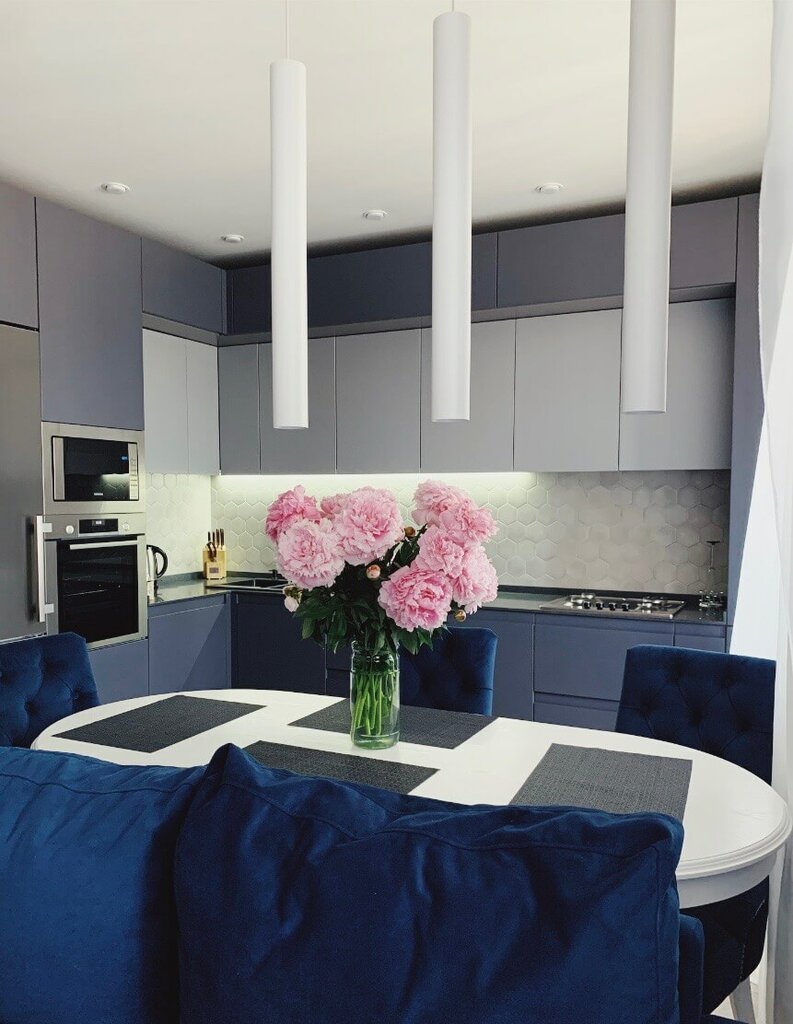 р. Чувашия, Вурнарский р-н, 2020г Фасады: крашеный глянец с интегрированными ручками Столешница: глянцевый искусственный камень Фурнитура: hettich со встроенным холодильником Ящики в цвет фасадов и столешницы
