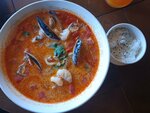 Хороший, красивый и очень уютный интерьер. Есть раздевалка и очень красивая уборная. В интерьер вложено много денег. Меню очень (ОЧЕНЬ) большое! Не знаю на сколько это плюс... Из того что пробовали: бургер на 3/10 холодная булочка, пожареная на масле и тоненькая фуловая котлета. Салат с крабом, супруга даже есть не стала... Ужасное сочетание соуса и не совсем свежих овощей. Мидии в блю Фиш, 4/10. Плохо промыты, сами мидии не плохого качества. Фирменные пирожки с капустой 5/10 тесто плохо разрешено есть комочки и карактерный привкус теста... Чебуреки с крабом 7/10 соус можно сделать по сложнее. Upd: 1.11.2025 Меняю отзыв на 5*. Заведение поменялось. Классическое меню, приятный том ям (хотя был не горячий) с большим количеством креветок. И бургер, который стал несомненно лучше но все равно велдановая котлета... Паста тоже понравилась.
