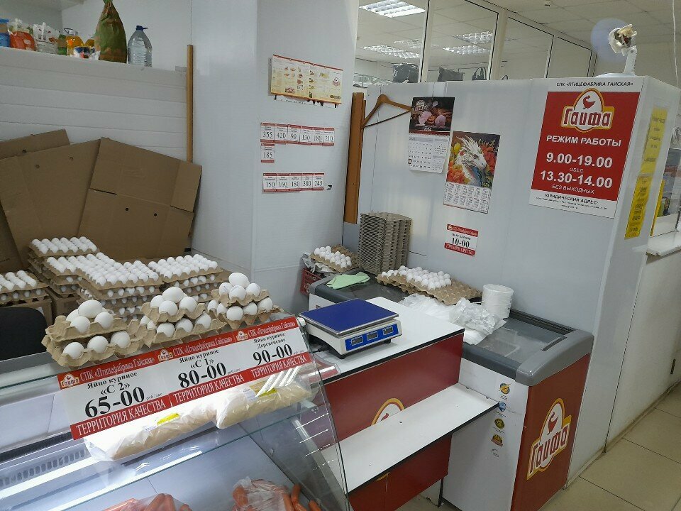 Выбор маленький, расположение отдела «колхозное», парковка маленькая, продавец вежливый, цена на яйцо как и во всех магазинах и отделах « Гайфа» хорошее, яйцо «деревенское» 76 рублей десяток.