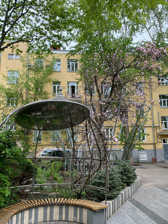 Двор открыт с двух сторон (30.04.23). Внутри ретро авто, детплощадка, очень красивый зеленый островок: розы, нарциссы, лещина и магнолия!! Она прекрасна. Спасибо тем, кто создает и поддерживает эту красоту! Место тихое.