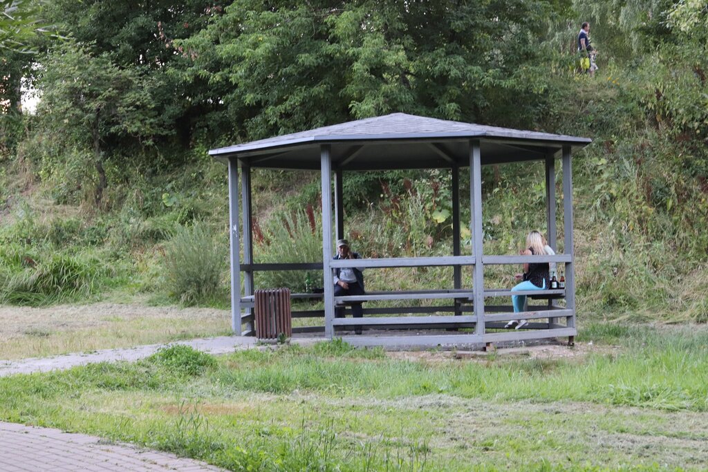 Беседка на открытой площадке рядом с прогулочной тропой парка. Вечернее время, в беседке есть отдыхающие.