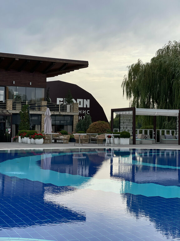 Начнем с плюсов: Красивая территория и интересный ландшафтный дизайн. Ооооочень чистая вода в бассейне без посторонних запахов и вкусов 😀теплая даже очень, охладиться в теплый день не удалось но детям норм. Чисто на всей территории. Теперь минусы: Мы очень любим поесть, но в этом месте я так и не смогла ничего для себя выбрать. Детского меню тоже нет. Странные, на мой взгляд, блюда и меню в целом. Сотрудники не очень приветливые, за меню пришлось идти самим, зонт никто не предложил помощь раскрыть, ну и общение официанта тоже оставляет желать лучшего, не очень приветлив и даже где-то надменно.