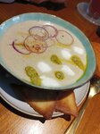 Место атмосферное. Хочется делать фото на каждом шагу. Везде в огромных горшках стоят фикусы-великаны. В первом зале расположена барная стойка и столы для гостей. А во втором зале оркестровая яма, причём она находится уровнем ниже, чем весь ресторан. Очень интересная планировка. В ресторане завтраки подают до вечера 😃. И к каждому заказанному завтраку приносят бокал игристого. Очень приятное дополнение. Еда -пальчики оближешь. Мы ели суп, завтрак из Тель-Авива, пирог с творожный сыром, фалафель и чай. К супу подавали поджаренные гренки. Блюда приносили быстро. Официант был очень учтив и внимателен. Место очень крутое. Обязательно придем сюда еще раз.