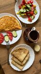 По отзывам решили заглянуть в кафе Геми. С виду непреметное заведение, скромненькая вывеска, на улице совсем мало столов. Заказали лагман, куриный бульон и янтык с картошкой и зеленью. Я как большой ценитель лагмана, осталась очень довольна - густой наваристый бульон, очень очень много мяса. К слову, дома мы с мужем часо готовим лагман и столько мяса не получается на одну тарелку даже у нас 😅. Но малюсенький минус - это качество макарон, хотелось бы более твердые, но это уже дело вкуса. Мужу куриный супчик показался слегка пресноват, но курицы тоже было много. По янтыку мнения разделились, мужу понравилось, а мне не хватило соли в картошке и тесто толстовато. На следующее утро заглянули на завтрак, попробовали сырники и омлет. Все очень вкусно, омлет воздушный.