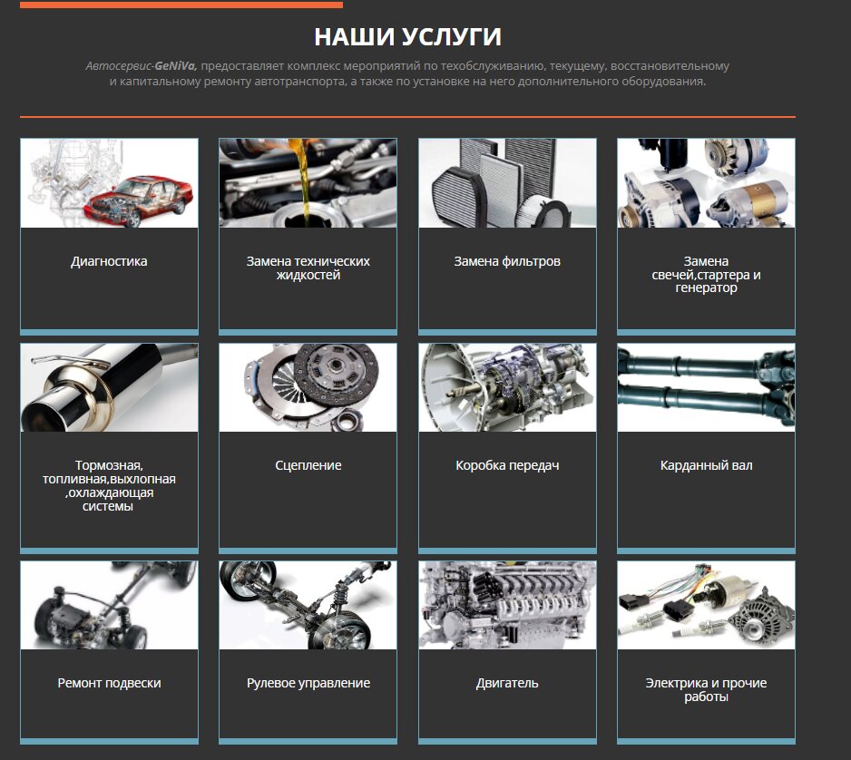Repair sevices:car window protection, exhaust system repair, repair of brake system, auto repair, engine repairs, full car sevice, oil changes, installation of parking sensors, running gear repair, starter motor repairs, computer car diagnostics, car electrician repair, steering racks repairs, nozzle cleaning, fuel injector cleaning, car alarm, gearbox repair, generator repairs, repair injectors, repair of drive shafts, repair of fuel system, automotive electronics repair, carburetor repair, repair of car radiators, repair of cylinder head, headlights repair, pneumatic system repair, RKPP repair, removal of catalysts, restoration of levers, car bridge repair, clutch repair, repair of autonomous heaters, installing additional equipment