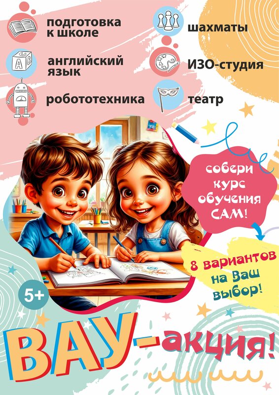 Classes for children:arts and crafts, pictorial art, inventiveness, history, computers and programming, foreign language, music, modeling, robotics, mathematics, theatrical creativity, physics, chess, speed reading, logarithmics, financial literacy, calligraphy and literate, sculpting, lego lessons, design, English language, neurohymnastics, informatics, surrounding world, speech development, memory development, reading, soap making
