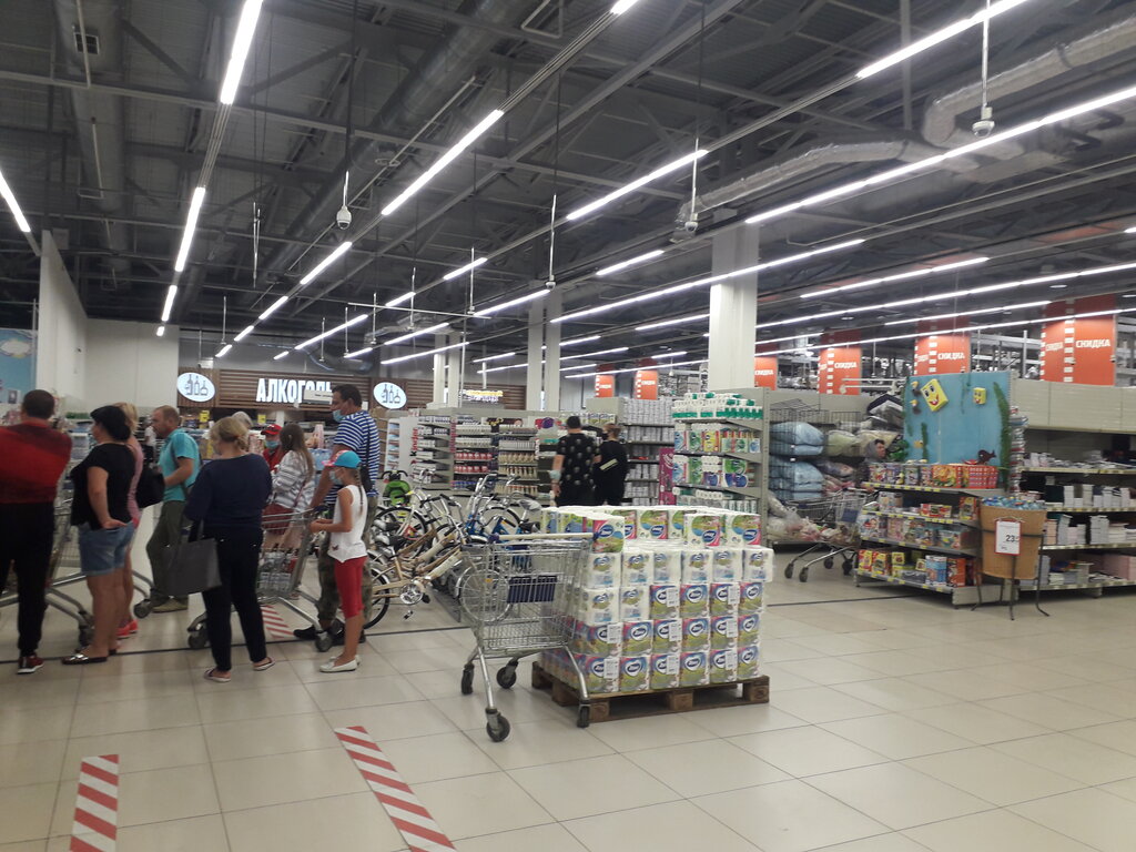 Для Советского района удачное приобретение. Сейчас там вменяемый продуктовый, с интересным ассортиментом и порой акции прикольные. Фрукты бывают не дорогие и красивые по сравнению с другими магазинами. Короче не дорогая цена не за счет качества. Рядом хороший детский магазин. Выбор для повседневки внушительный. Очень удобно что все можно примерить, потрогать как тянется, да и сразу понятно качественная вещь или нет. По фото так не поймешь. Игрушки тоже есть, можно повыбирать. Рядом бывший Леруа, что только плюсом. Подъезжать удобно, выезд тоже без проблем. Парковка без лабиринта и блужданий. Остановка тоже рядом, можно и без машины приехать. Кстати там еще много плюшевых игрушек больших, ростом от метра до двух. И ценник у них адекватный. Не хватает рядом территории с качелько-каталками для детей и посиделок-прогулок для всех и было бы отлично.