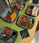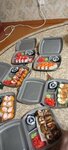 Variety of food:sushi and rolls, sweets, pizza, fixed meal, сhinese food