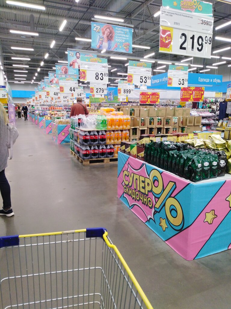 Стандартный гипермаркет. Очень большая парковка, которая давно не видела ремонта, много ям и дыр в асфальте. Наполненность товарами хорошая. Мало товаров местных (вологодских) брендов и производителей. Как и везде, мясная витрина, выпечка. Есть кассы самообслуживания. Ценники есть на всех товарах.