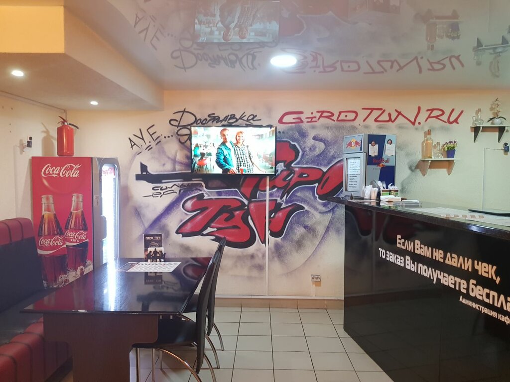 Добрый день! Посещала гиро-тун и осталась в восхищение от качества обслуживания сервиса. Безумно понравилось быстрая, вежливая, и грамотная работа кассира. Повар быстро и вкусно приготлвил блюдо. Рекомендую к посещению данное заведение, здесь вас быстро, вежливо обслужат и вкусно накормят.