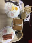 Интерьер неплохой, но. Работает на раздаче одна хамоватая тетенька - принимает заказы, разносит и моет посуду одновременно в связи с сем очередь выстраивается до двери. Кофе , яичница и сосиски - все что нельзя испортить, сьедобно вполне. Были заказаны блинчики с печенью - сведесть окащалась непервой, поэтому проследовали в мусорную корзину. В общем, к посещению не рекомендуется! ❌❌❌ Завтра пойдем искать близлежащие точки общепита на завтрак 😁