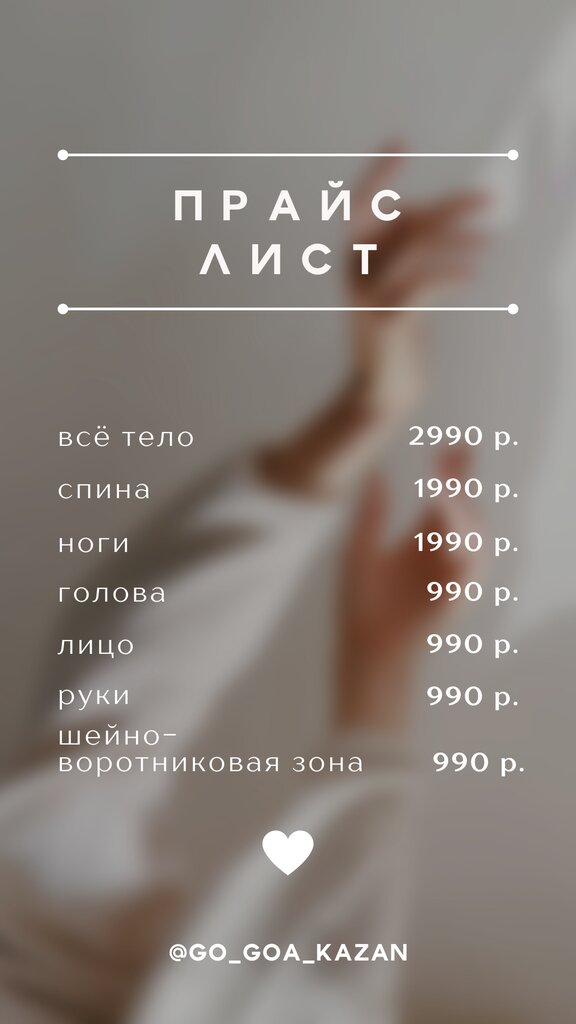 Types of massage:cellulite massage, neck massage, relax-massage, general medical massage