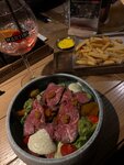 Сочная говядина, обжаренная до совершенства, дополнена хрустящим луком фри и нежной фокаччей. Сливочно-перечный соус придаёт блюду изысканный вкус. Молодой отварной картофель гармонично дополняет это сытное блюдо