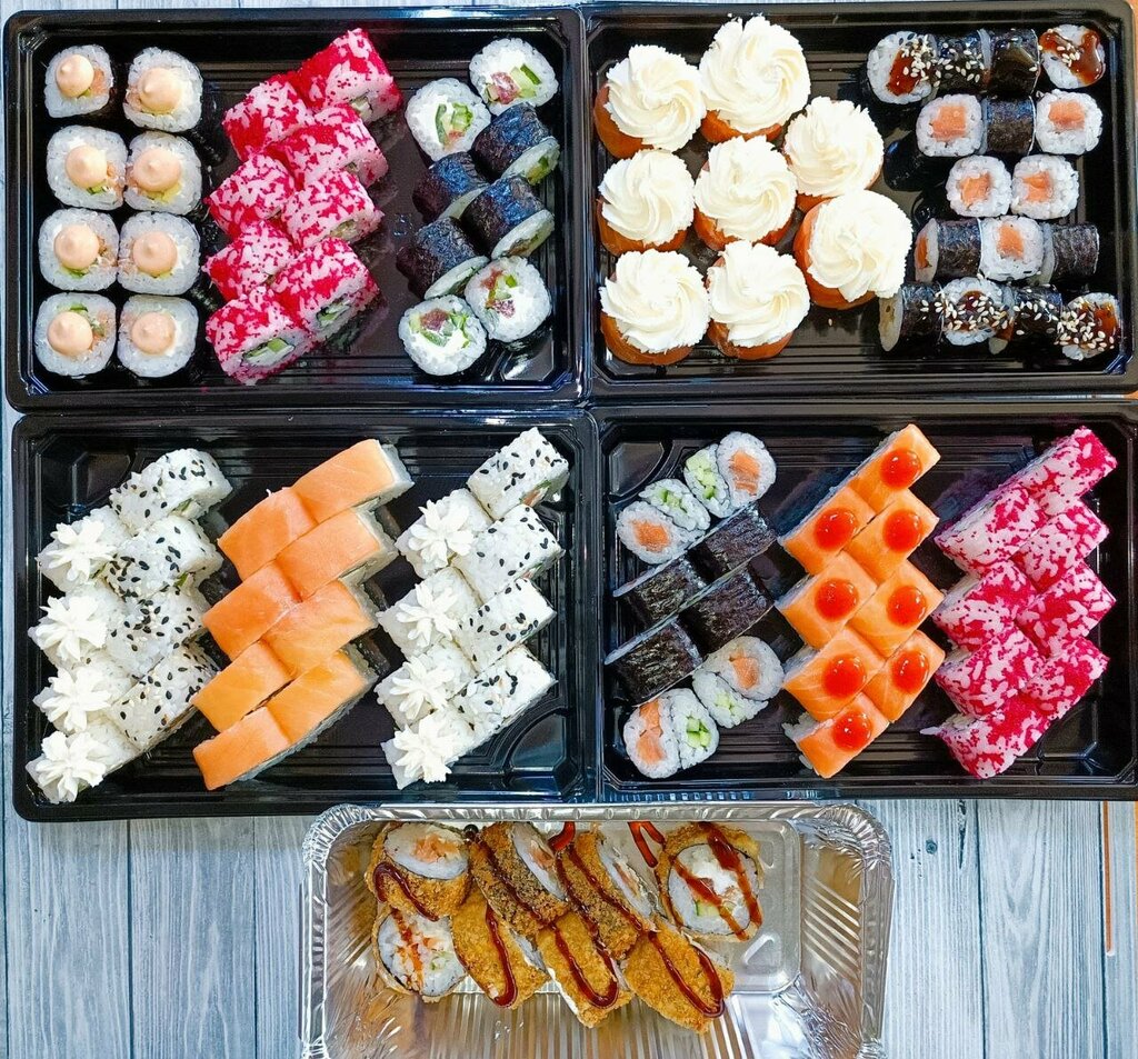 Variety of food:sushi and rolls, pizza, сhinese food, home cooking, baking