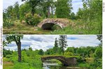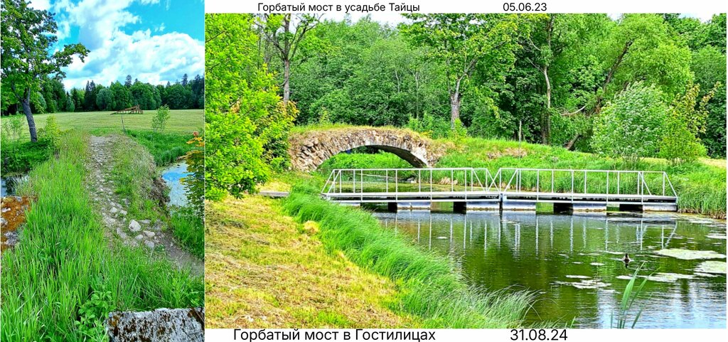 Горбатый мост.   Как-то так получилось, что старинные, заброшенные парки окружали меня с детства,- это имение Тайцы(, да и парк в Ломоносове, где жил дедка, тоже в 70-е не процветал). И был у меня в парке Демидова(Тайцы) любимый горбатый мостик, чем-то похожий на этот. 50 лет спустя увидел, что создатели экомаршрута в Тайцах, наверное, не зря навели понтонный мост рядом, а вход на мой любимый горбатый мост заставили блоками, см. фото.   Здесь мостик исправно играет роль парковой инфраструктуры, позволяя обходить Пиличный пруд по периметру. Но как бы добротно ни строили наши предки... .   Очень хочется чтобы дошла очередь и до восстановления и этой великолепной усадьбы.