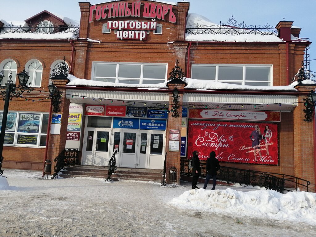 Отличный торговый центр в самом центре города. На цокольном этаже находится магазин строительных материалов, так же там можно приобрести ковры и ковровые дорожки. На первом этаже находятся магазины женской, детской, мужской одежды, нижнего белья, обувных отделы. Очень красивый отдел с сувенирами, есть отдел аксессуаров для машин и т.д. На втором и третьем этажах расположены офисные помещения, в частности БТИ. Перед магазином имеется просторная парковка. В целом впечатление складывается очень приятное. Рекомендую всем побывать в Гостином дворе.